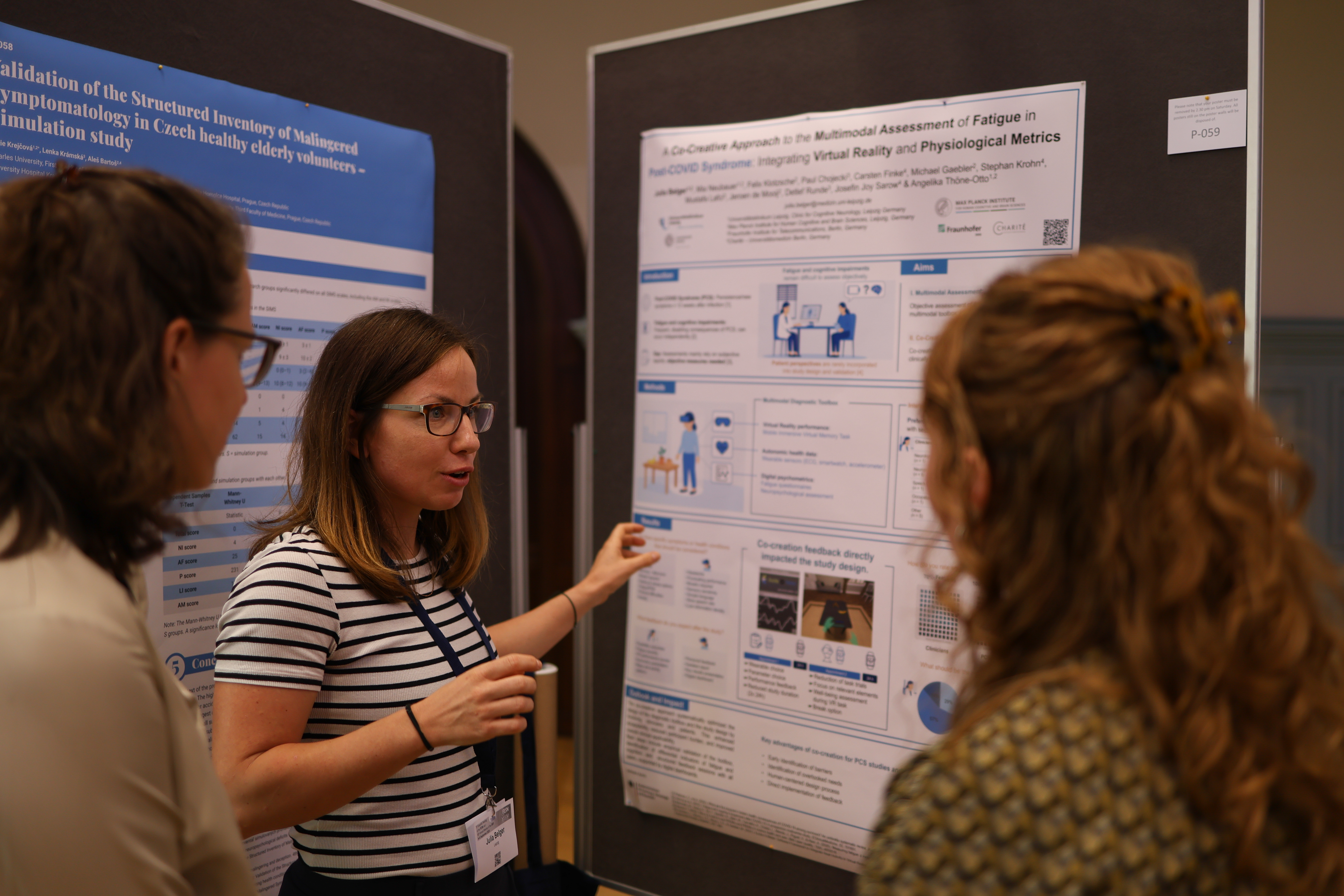 Dr. Julia Belger, Postdoc an der Tagesklinik für kognitive Neurologie am Universitätsklinikum Leipzig, stellte dort das Poster “A Co-Creative Approach to the Multimodal Assessment of Fatigue in Post-COVID Syndrome: Integrating Virtual Reality and Physiological Metrics”vor. Präsentiert wurde der Verlauf unseres Projekts sowie die Ergebnisse der Co-Creation mit dem Ziel einer patientenzentrierten, klinisch umsetzbaren Studienplanung.